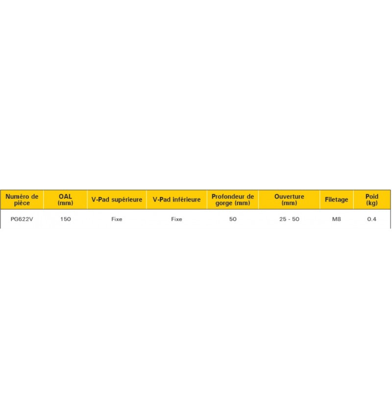 Profondeur gorge: 50mm - Ouverture 25-50 mm - longueur totale: 150mm - poids0.4kg