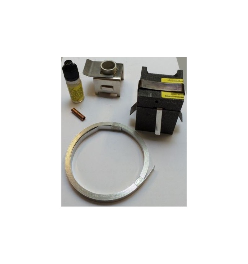·un Kit aluminothermie avec moule support, feuillard inox, un capsule de poudre, un creuset graphite, 1 flacon de flux décapant.